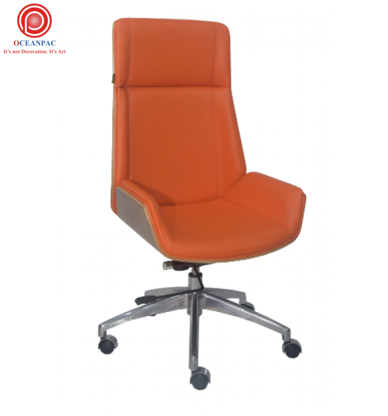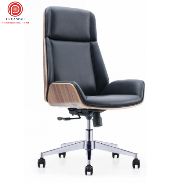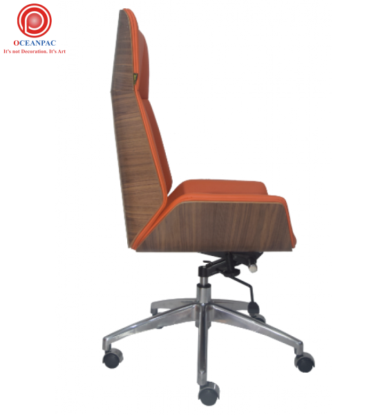 Chất liệu: lưng cao bọc Pu, mặt sau ốp gỗ nguyên lưng tựa, chân nhôm, mâm 2 cần