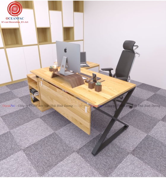 Bàn Giám Đốc Chữ L: X concept chân sắt hộp 25x50mm hình chữ X. Bàn văn phòng gỗ cao su ghép (TCAA) 2 mặt đẹp hoặc MDF chống ẩm (TCVN) dày 17mm sơn PU màu gỗ tự nhiên phù hợp với môi trường văn phòng, phòng làm việc gia đình. Đối với các văn phòng mở, văn phòng kết hợp với cây xanh thì việc sử dụng bàn gỗ kết hợp chân sắt trở nên hoàn hảo. Chất liệu gỗ tại OceanPac là gỗ ghép cao su hoặc là gỗ MDF chống ẩm dày 17mm đảm bảo tiêu chuẩn sản xuất tại nhà máy ( 2 mặt đẹp) được xử lý qua 4 công đoạn trước khi sơn PU hoàn thiện cho bề mặt sản phẩm rất đẹp mắt, chống nước tuyệt đối với khung chân sắt được sơn tĩnh điện bền đẹp cùng năm tháng.